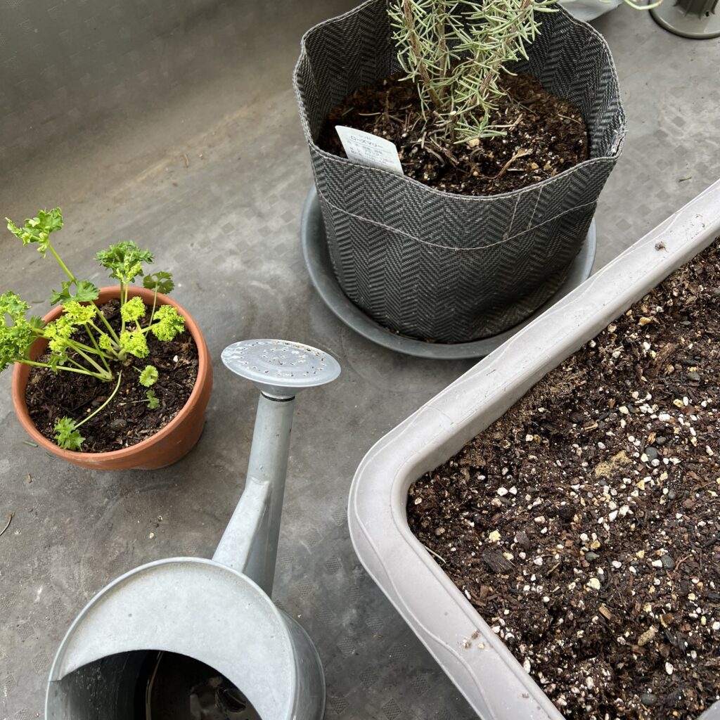パセリは前日に苗を買ってきて余っている鉢に植えた。ローズマリーは鉢が小さくなったので植え替え。パセリはサラダに。実はローズマリーは昨年購入してからほったらかしにしていたのだが、料理や入浴剤にもっと活用しようと思っている。